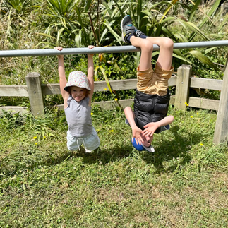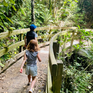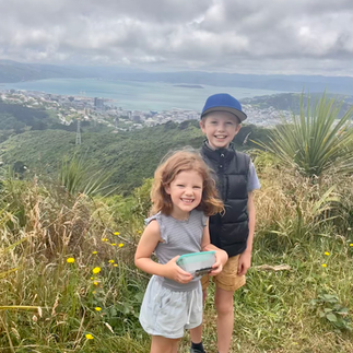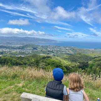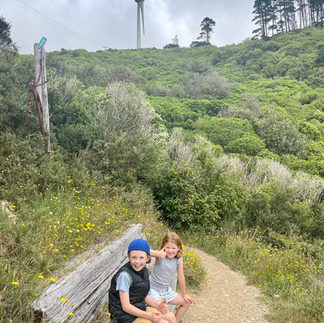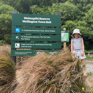 We started at the Polhill Reserve in Aro Valley, the kids had their usual photo with the entrance sign and then decided they needed to complete some stretches on a random poll they found - as you do...once they felt suitably prepared we began our walk towards the Wind Turbine.